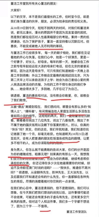 2012年10月,董洁处事室片刻发布仳离声明。