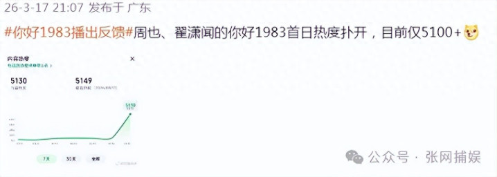 3月17日爱奇艺首播,《你好1983》开局号称“难过级”:官博预热常常手滑,把剧名打成你好1938,基础宣发造作束缚;女主周也粉丝起火平台资源歪斜,告成发起“0包场”按捺,硬生生遭殃初期热度;首播2小时站内热度堪堪4800,全天仅5100+,连6000的基础缱绻值都没摸到,妥妥的垫底预定。