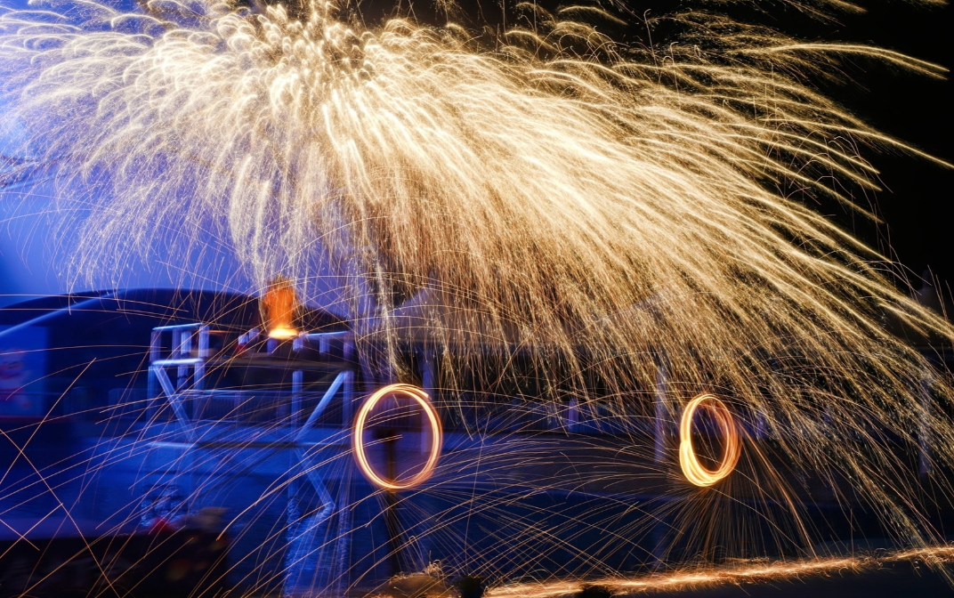 水上乐土舞台准时迎来一天中最酷热的时辰。1600℃的铁水被尽力击向夜空,霎时那,金色的铁花如流星雨般流泻而下。这即是传承千年的非遗绝技——打铁花。