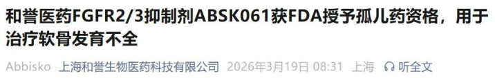 3月19日,和誉医药告示,其自主研发的高采选性小分子FGFR2/3扼制剂ABSK061已获取好意思国食物药品监督料理局(FDA)授予的孤儿药履历(ODD),用于诊治软骨发育不全(ACH)。此前,ABSK061曾获取FDA冷漠儿科疾病(RPD)履历认定。