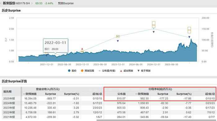 按照年报败露的数据来看,新泉股份2025年出现“增收不增利”的情况。另据Wind金融汇编的数据,15家机构对新泉股份2025年归母净利润的一致预测值为9.923亿元,因此按照公司败露的8.15亿元的数据来看,是不足预期的(-17.86%),且低于系数15家机构给出的预测值。