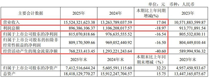 3月19日晚间,新泉股份(SH603179,股价69.53元,市值354.7亿元)败露2025年年报,公司2025年杀青营收155.24亿元,同比增长17.04%;杀青归母净利润8.15亿元,同比下滑16.54%;杀青扣非净利润8.09亿元,同比下滑16.5%;基本每股收益1.66元,同比下滑17%。公司向整体股东每10股派发现金股利3元(含税),剩余未分拨利润结转以后年度,以成本公积金转增股本,每10股转增4股,不送红股。