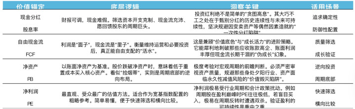 “价钱”是屏幕上的数字,由东谈主性的权谋与陶醉交游出来;而“价值”,则是企业在贸易预备中的真实重量。低估值策略之是以经常被扭曲,是因为东谈主们经常只看到了它名义的“低廉”,却忽略了它在寻找不同“价值锚”时具备的投资积极兴味,以常用的一些估值预备例如来看: