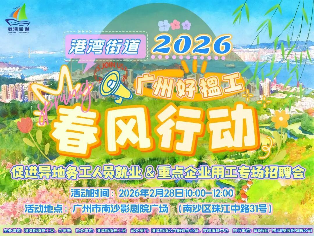 归程已暖归心,春风再送远景。春节前后,街说念通抵制卷窥伺动态监测要点企业用工情况,实时掌持职工返乡返岗动态,在此基础上,将于2月28日举办“春风行径2026-广州好搵工”专场招聘会。现场将组织智能制造、当代服务、数字经济等限制企业爱才如命,瞻望提供岗亭约800个,助力务工东说念主员顺利返岗、踏实做事。